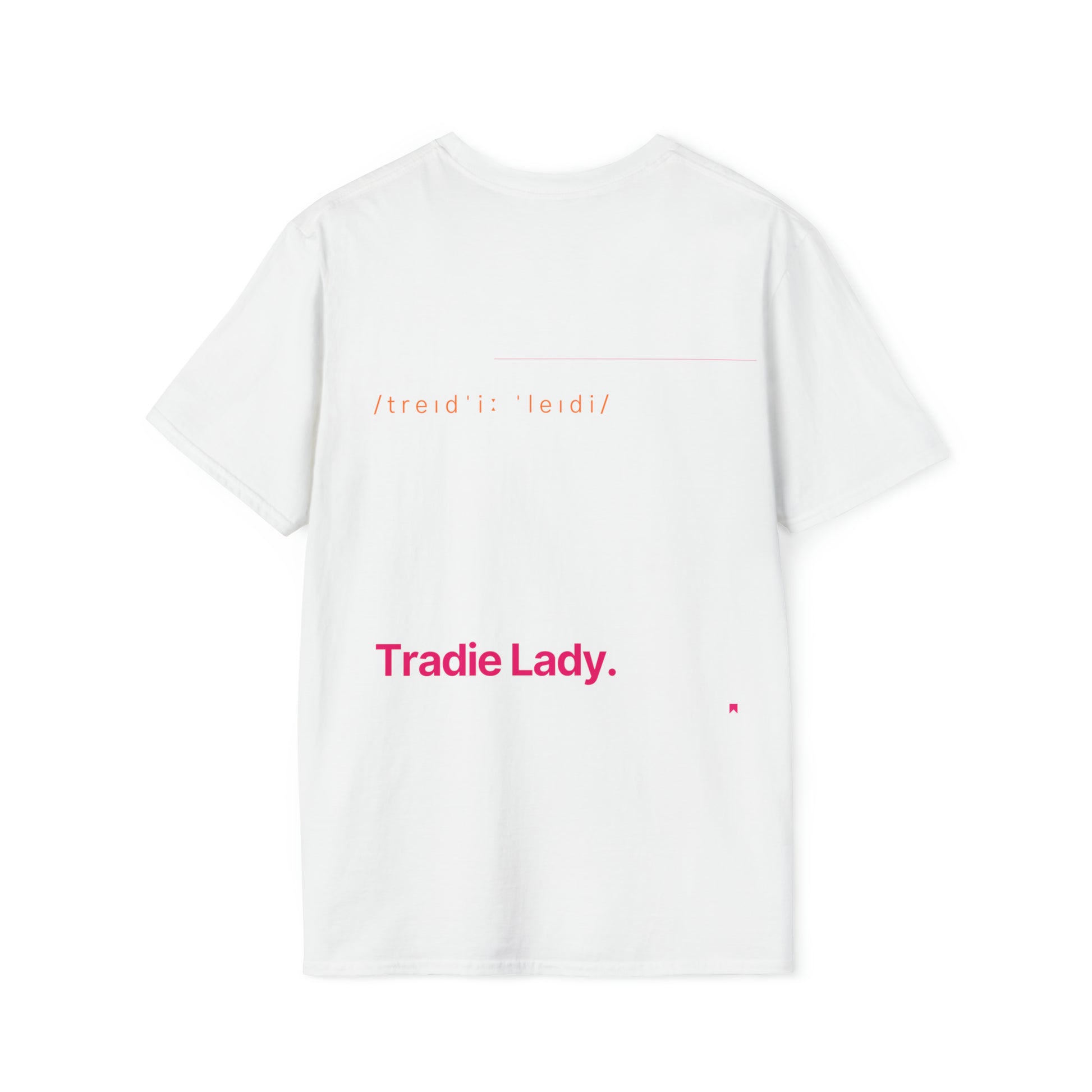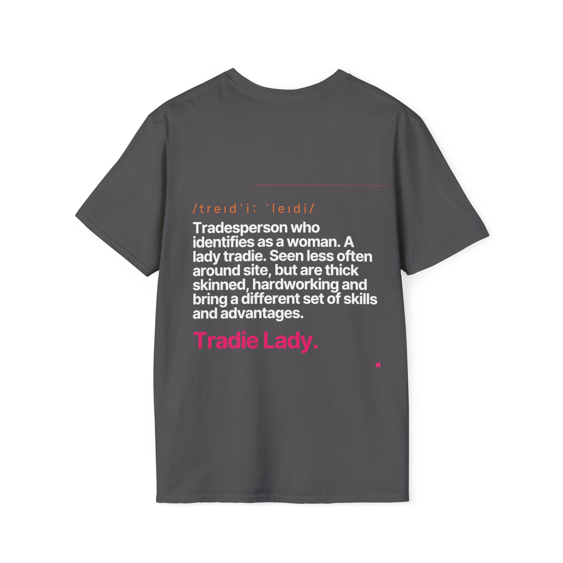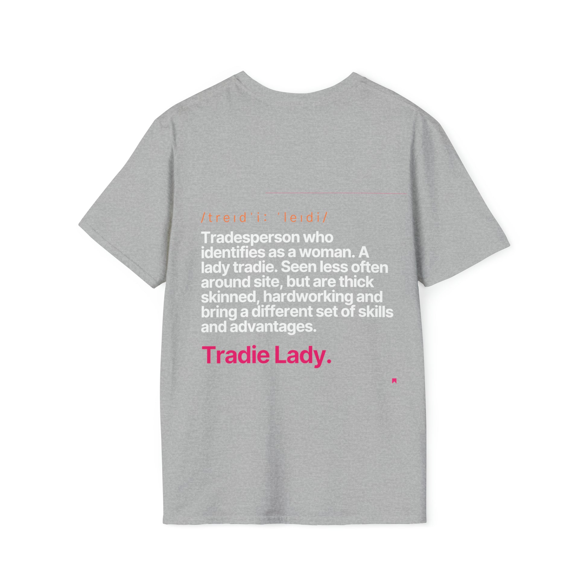 Step out in style and make a statement with our Tradie Lady Soft-Style T-Shirt! This isn't just any tee; it's a shout-out to all the fierce and fabulous Tradie Ladies out there. With the empowering 'Tradie Lady' definition printed boldly, it's a conversation starter and a head-turner all in one. Crafted for those who love a blend of comfort and sass, this tee is made from the softest materials, offering a snuggly hug with every wear. Say goodbye to side seams and hello to a sleek, smooth fit. And those shoulders? Reinforced with twill tape for some extra swagger.
