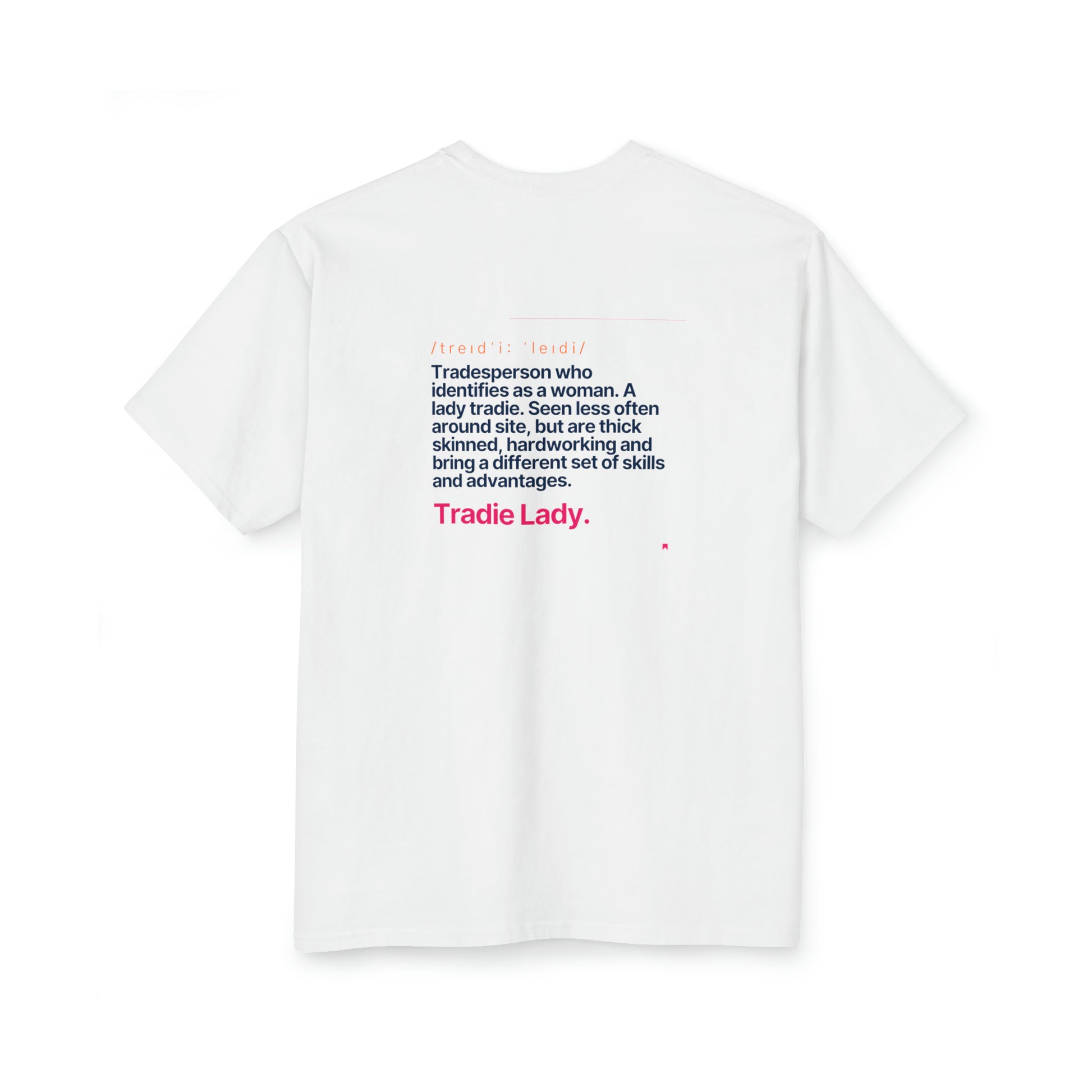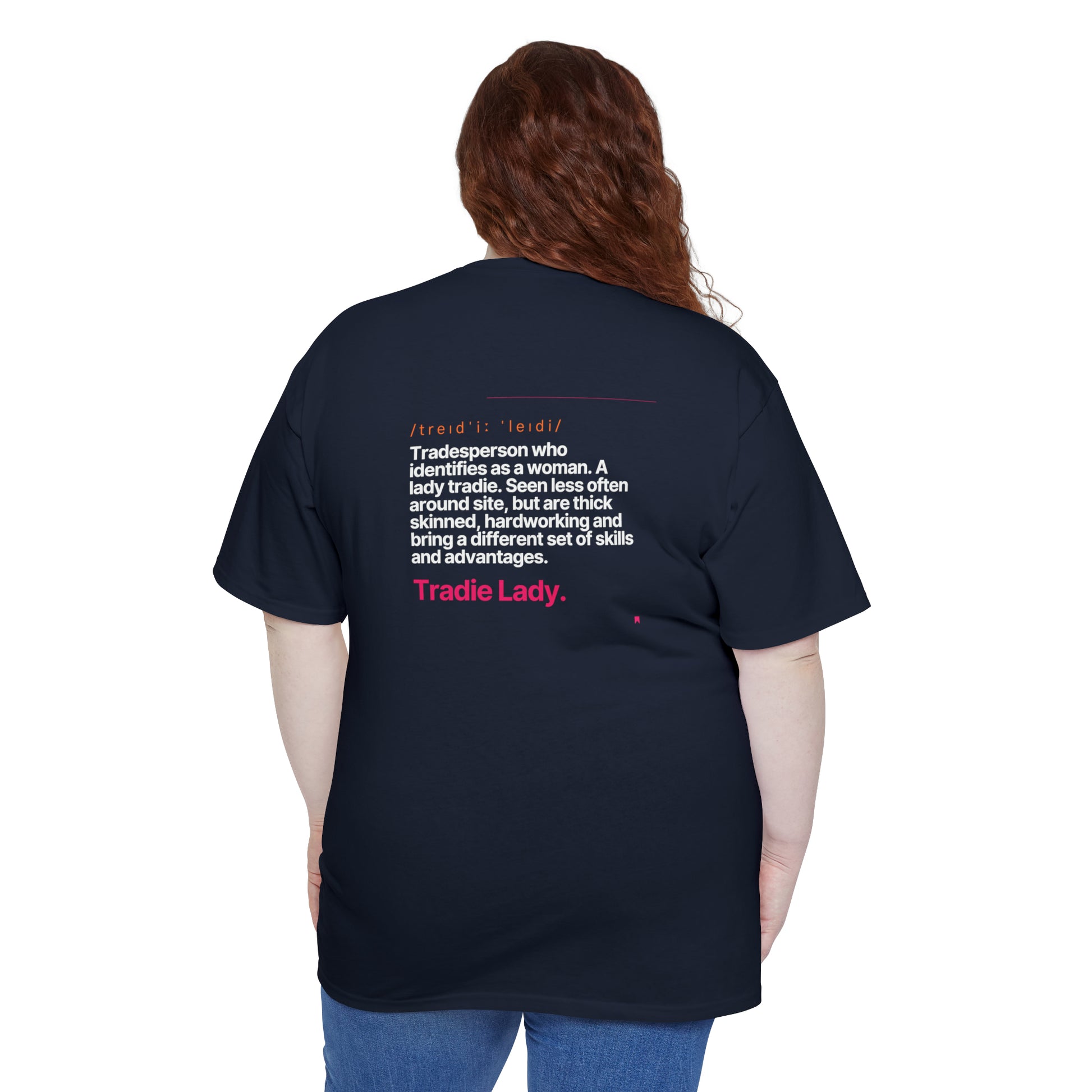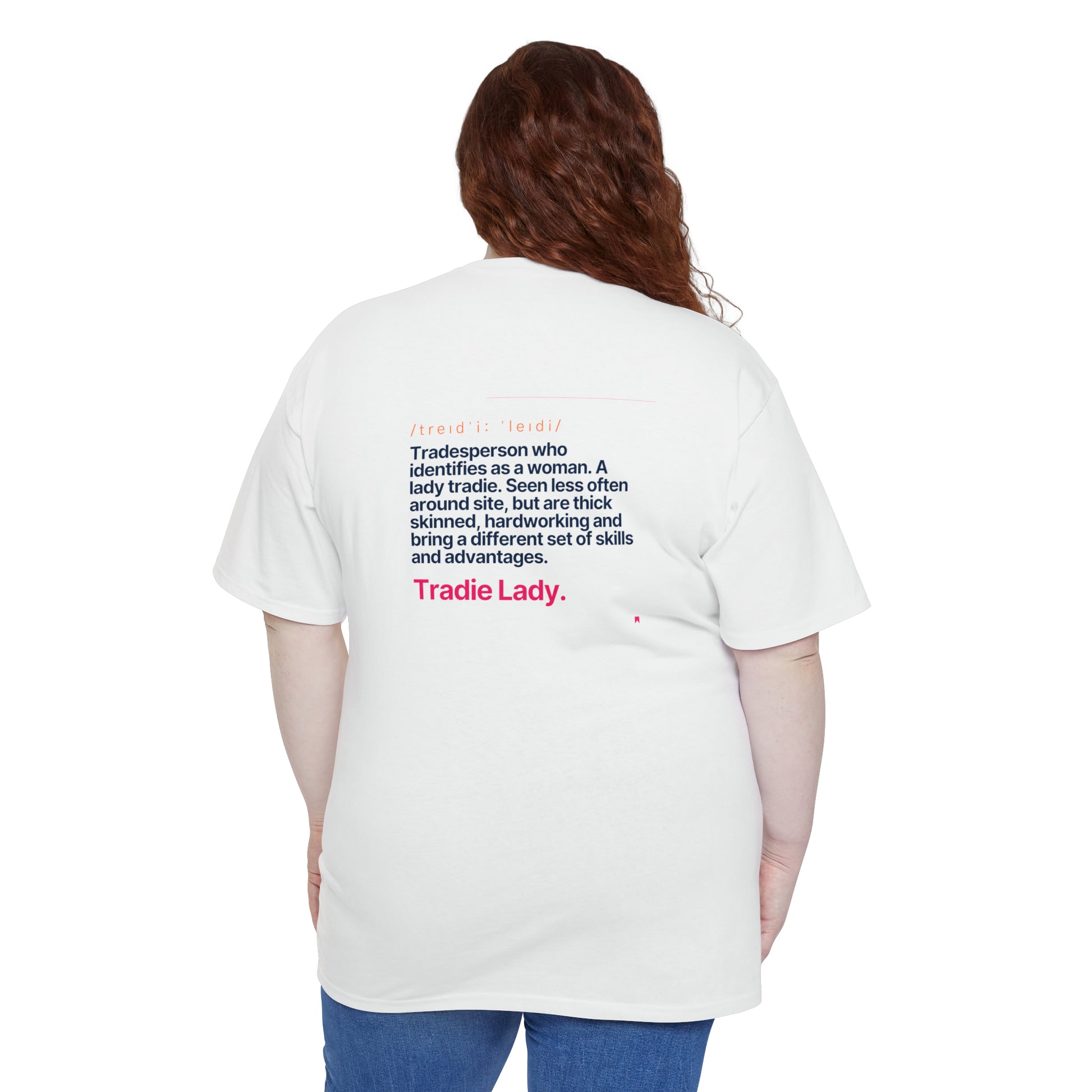 This Tall-T has got 'Tradie Lady' swagger written all over it (well, actually, on the back!). For those who tower tall or love a roomier fit, this classic-fit t-shirt is your dream come true. Crafted from 100% pure cotton, it's the comfy that makes you want to live in it. With 'Tradie Lady' definition gracing the back wearing this T you are giving a nod to all the fierce women out there breaking barriers and stereotypes